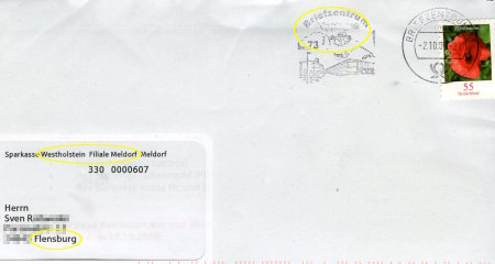 Hm, die Kontoauszüge kamen auch letzte Woche und die waren (noch?) ganz normal maschinell frankiert und kamen mit der gelben Post. Flensburg ist sicherlich ausserhalb des normalen Einzugsgebiets der Sparkasse Westholstein, aber dürfte im Gegensatz zum Einzugsgebiet lokale Zusteller haben. Bzw. hat, dass die Briefe durch die nicht-gelben hier nicht im Briefkasten sondern sonstwo landen hab ich schon gebloggt, hoffentlich passiert das mit der Post der Sparkasse nicht auch, das wäre ein Grund das Geldinstitut zu wechseln.
