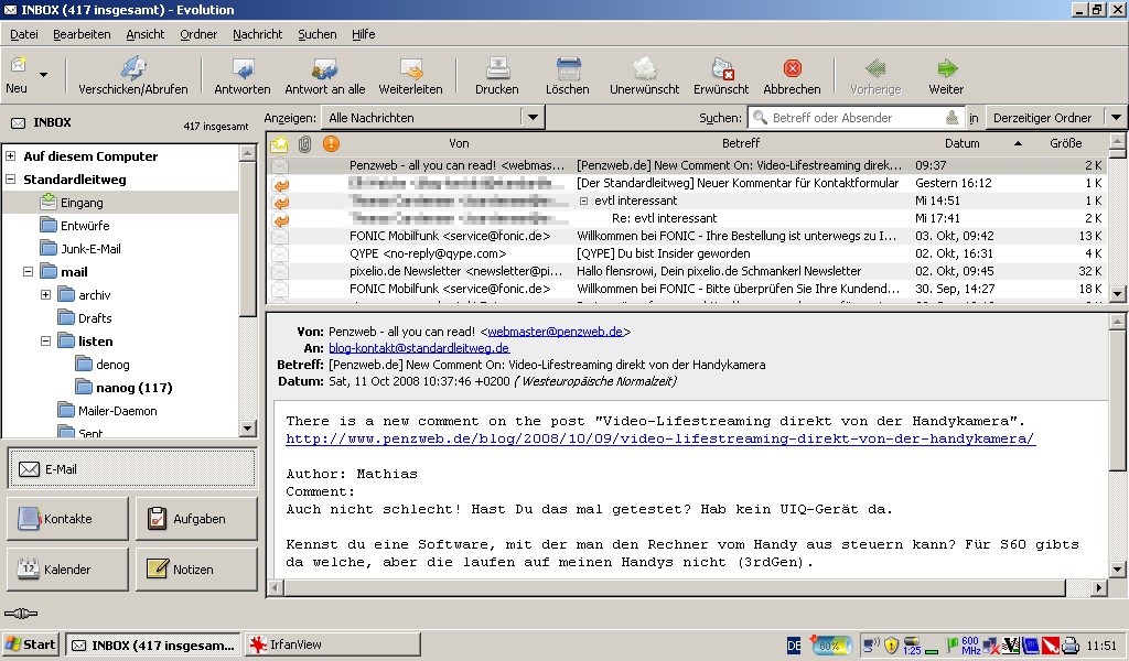 Was ist Evolution? Evolution ist soetwas wie das “Outlook von Linux”. Wobei ‘Outlook’ in diesem Zusammenhang nicht mal abwertend gemeint ist sondern den Funktionsumfang beschreibt. E-Mail, Adressen, Kalender, To-Do-Liste und Memos sind die Hauptkomponenten. Unter Linux kann es via dbus auch noch mit diversen Anwendungen kommunizieren wie dem Instant-Messenger pidgin. Den gibt es auch für Windows, ob auch da ein Verbindung beider Programme möglich ist werde ich noch testen. Im Gegensatz zu Outlook ist E-Mail bei Evolution nicht nur notdürftig an eine Groupware-Lösung angepappt sondern “echt”.