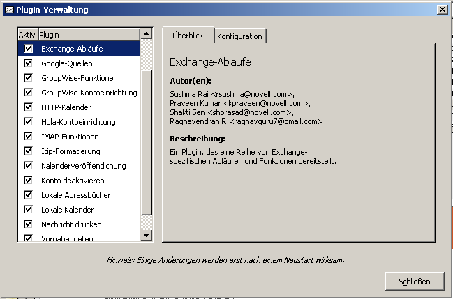 Wie auch bei Thunderbird sind viele Funktionen über Plugins realisiert, dazu gehören Basisdinge wie IMAP aber auch Funktionen für Exchange und Novell GroupWise oder Hula-Kalender. Eine aktive Community wie für Thunderbird-Add-Ons existiert allerdings nicht. Mir scheint aber auch der Bedarf geringer zu sein, Evolution macht die Dinge die ich oben als Hauptkomponenten aufgeführt habe und die macht es ordentlich. Und im Gegensatz zu Thunderbird1 kann es auch unter IMAP artgerecht löschen ![]()