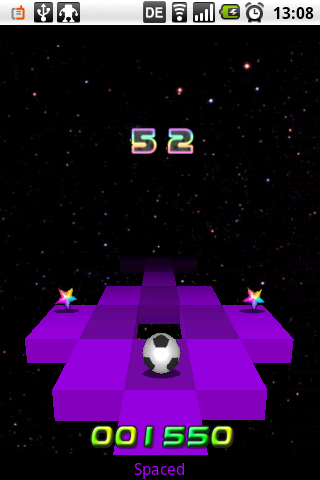 Das Gleiche gilt für die Steuerung bei _Hyperspace_: Hier rollt ein Ball über eine Strecke bis zum Ziel. Auf dem Weg gibt es Felder bei denen er springt oder gebremst wird und es liegen Bonusgegenstände rum. Die Strecke ist nicht lückenlos, sie ist mal enger, mal fehlt ein Streifen oder auch nur ein Element in der Mitte. Runterfallen darf der Ball natürlich nicht