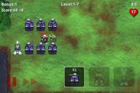 Robo Defense ist das Android Spiel überhaupt. Kein anderes Spielprinzip habe ich in annähernd so vielen Versionen im Market gefunden. Auch hier wieder ein einfaches Spielprinzip: Diverse Gegner laufen links ins Bild und sollen daran gehindert werden den rechten Rand zu erreichen. Dazu baut man so viele stationäre Abwehrtürme auf wie das Budget hergibt die dann hoffentlich die Invasoren erfolgreich vernichten. Für jeden abgeschossenen Angreifer gibt es Geld von dem man seine Verteidigungsanlagen aufrüsten kann. Das sollte man mit Bedacht tun, denn die Gegner werden immer stärker. Ein geschickter Mix aus Waffenart und Plazierung ist gefragt. Türme mit größerer Reichweite besser nach hinten damit vorn Platz ist für die Türme mit kürzerer Reichweite. Türme deren Geschosse den Gegner verlangsamen sollten so plaziert sein dass die Verteidigungsanlagen dahinter mehr Zeit haben den Gegner zu beschiessen. -Obwohl ich ein Strategiefreund bin hat es mich das Konzept bisher nicht wirklich gefesselt, aber ich denke im Traum nicht daran es zu deinstallieren, dafür ist es dann doch- _zu_ spassig