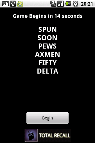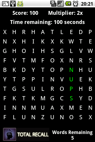 Total Recall ist wie gesagt ein Wortsuchspiel. In einer Buchstabenmatrix soll man 5 Worte finden. Der Clou dabei: Die Worte die man finden soll werden vor der Matrix für eine kurze Zeitspanne (abhängig vom Schwierigkeitsgrad) angezeigt. In dieser Zeit muss man sie sich merken und anschliessend finden. Und nein, Worte wie "Hund", "Katze", Maus" sind es nicht. Eher wilde Buchstabenkombinationen. Das klingt nicht aufregend, ist es auch nicht. Aber es trainiert das Gedächtnis und ist nicht so schwer wie es klingt. Und es ist auch motivierend: man versucht immer besser zu werden, ganz automatisch.