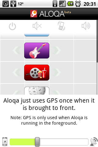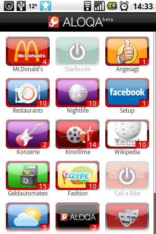 Heute ist Automagie-Tag ;) Mit Aloqa kommt ein weiteres Programm dessen Automatik ein wesentlicher Programmteil ist. Es ist ein Ortsbezogener Eventinformationsdienst der anhand des aktuellen Standortes (Netzwerkbasiert reicht — GPS wird nur genutzt wenn die Anwendung im Vordergrund ist und der Akku eine eingestellte Mindestladung hat) Informationen zur Umgebung auflistet und sich dafür auf verschiedene Quellen stützt. Je nach Art wird nur der Standort gezeigt (z.B. von Geldautomaten) aber wenn vorhanden hat man Zugriff auf weitere Informationen wie die Bewertungen bei Qype bei Restaurants und Geschäften. Der Clou ist aber die Benachrichtigungsfunktion: so kann man sich bei neu gefundenen Elementen aktiv alarmieren lassen und für jeden Bereich getrennt einstellen ob das akkustisch oder per Vibration geschehen soll.
