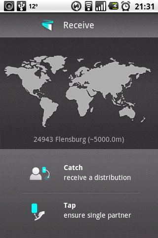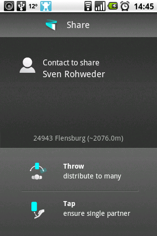 Noch cooler ist allerdings das derzeit nur für Android erhältliche Hoccer: Es arbeitet nach den gleichen Prinzipen wie bump — kann aber mehr. Zum einen kann man nicht nur Kontaktinformationen sondern auch Bilder, Texte und Bookmarks. Statt die Telefone gegeneinander zu stossen stupsen beide das eigene Telefon kurz von unten an. Das funktioniert auch quer über einen grossen Tisch, eine ungefähre Ortsbestimmung muss aber möglich sein — Netzwerkbasiert (nur GSM Empfang) reicht. Diese 1:1 Verteilung ist wie bump, Hoccer beherrscht aber auch 1:n Verteilung: Der Redner steht in einem grossen Saal vorn und will seinen Zuhörern z.B. ein Bild “hoccern”. Dazu wählt er das Bild aus und bewegt das Handy so als wenn er ein Frisbee in die Menge werfen will.