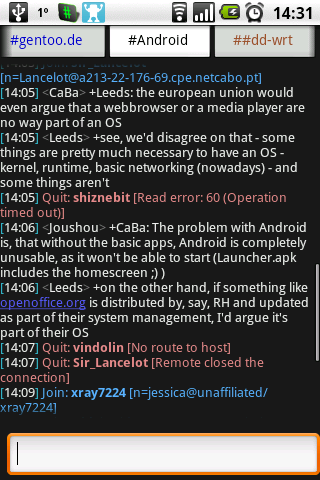 Von den kostenlosen IRC Clients die es derzeit für Android gibt ist AndChat meiner Meinung nach der Beste; das kostenpflichtige “Android IRC” ($4.95) habe ich allerdings nicht getestet, das ist im Markt genausogut bewertet. |