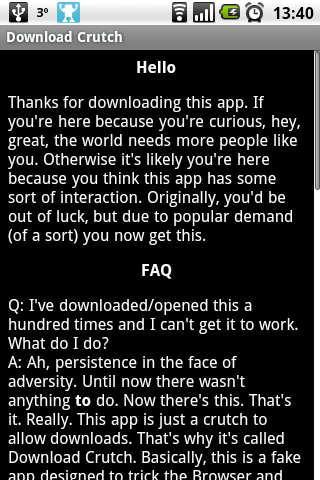 | Download Crutch ist eigentlich keine Anwendung. Jedenfalls nicht im herkömmlichen Sinne. Startet man es bekommt man nur den Hinweis dass es nichts zu sehen gibt und eine kurze FAQ. Aber wozu das Ganze? Download Crutch ist eine Hilfsanwendung die sich einfach für alles zuständig fühlt. Stösst man im Android Browser auf einen Download Link hängt es davon ab ob man eine geeignete Anwendung hat um die Datei zu öffnen was passiert. Entweder man bekommt eine Auswahl der geeigneten Anwendungen und kann sich entscheiden mit welcher man es öffnen will oder halt eine Meldung dass das Telefon damit nicht anfangen kann. Ein reines herunterladen von Inhalten die im Telefon nicht verarbeitet werden können ist nicht vorgesehen. Hier kommt Download Crutch ins Spiel. Es ermöglicht es, jeden Inhalt herunterzuladen. Man kann ihn vielleicht nicht direkt am Telefon verarbeiten aber zumindest schon mal speichern und am Rechner verwenden. Wirklich praktisch! |