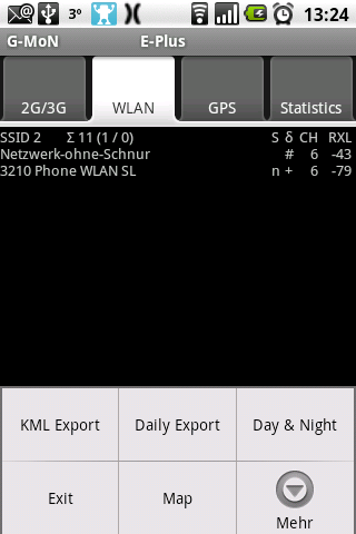 | Und wo wir das Telefon gerade zur WLAN Analyse benutzt haben gleich die nächste Anwendung dieser Art. Nur ein Fahrzeug reicht nicht, man muss die Netze ja auch irgendwie ermitteln während der Fahrt. Üblicherweise ist das der berühmte Laptop auf dem Beifahrersitz der mit einem GPS Empfänger gekoppelt ist. Ein Android Telefon ist im Prinzip genau das, integriert in einem kleinen Gerät. Und mit G-MoN gibt es eine Anwendung die den Rest erledigt. Die empfangenen Netze werden inkl. Feldstärke und Koordinaten laufend gespeichert. Das Ergebnis kann u.a. als .kml Datei für Google Earth exportiert werden. Ein nützliches Tool für die schnelle Kriegsfahrt, man sollte aber bedenken dass Telefone potenziell weniger empfindlich sind, schon allein aus Stromspargründen sind zu schwache Netze für sie normalerweise eh nicht nutzbar. Ich habe aber keinen direkten Vergleich mit einer Fahrt mit Notebook. |