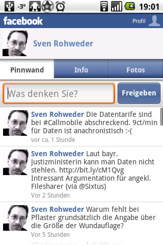 | Die VZ-Netzwerke (StudiVZ, SchülerVZ und MeinVZ) und Facebook sind wohl die beliebtesten Sozialen Netzwerke hierzulande. Für beide gibt es Android Apps für den mobilen Zugriff. Zwar startete der deutsche Platzhirsch StudiVZ als CopyCat von Facebook, aber mit der Android App waren sie schneller. Die erste Version war noch unterteilt in je einer für StudiVZ, SchülerVZ und MeinVZ, die aktuelleren Versionen heissen aber VZ-Netzerke und bieten in einer App Zugriff auf alle VZ-Netzwerke. Die grundlegende Struktur ist der Webseite nachempfunden. Man wird auf einer Startseite begrüsst die die wichtigsten Dinge zusammenfasst. Das sorgt dafür dass man sich sofort heimisch fühlt, andererseits brauche ich persönlich die letzten Besucher meiner Profilseite nicht gleich prominent auf der Startseite zu sehen. Ist aber sicher auch Geschmackssache. Über die Icons unten kommt man in die Abteilungen (von Links nach Rechts) “Mein Profil”, “Meine Freunde”, “Nachrichtendienst” und “Informationen” — mit rechtlichen Hinweisen (AGB, Datenschutz usw.). Praktisch wird wohl meist der Buschfunk der über die Startseite zu erreichen ist und die Freundesliste meist benutzt werden. Über die Startseite kann man über ein unscheinbares Icon oben Rechts auch Fotos hinzufügen. Diese können entweder aus den bestehenden hochgeladen oder mit der Handykamera aufgenommen werden. Insgesamt hat man mit der App einen sehr vollständigen Zugriff auf sein VZ-Netzwerk. Facebook kam wie erwähnt etwas später mit einer Android App und die erste Version war auch gleich ein glatter Fehlstart. Der Funktionsumfang war praktisch nicht vorhanden und wirkte wie an einem Nachmittag zusammengeklöppelt. Mit erscheinen des Motorola Droid bzw. Milestone hat sich das aber geändert, die aktuell im Markt erhältliche Version ist kein Vergleich zu dem anfänglichen Rudiment. Die Facebook App begrüßte einen mit einer aus 6 großen Icons bestehenden Auswahl mit den Hauptbereichen “Nachrichten-Feed”, “Freunde”, “Fotos”, Foto machen”, “Profil” und “Benachrichtigungen”. Über “Fotos” gelangt man zu seinen Fotoalben und kann hier Fotos hochladen und die Albendaten bearbeiten und natürlich neue Alben erstellen. “Fotos machen” startet die Handykamera, die gemachten Fotos kann man gleich in den Fotobereich hochladen. Die Seite “Profil” ist in drei Tabs unterteilt: “Pinnwand” mit seinen eigenen Nachrichten/Pinnwand, “Info” mit den persönlichen Daten, die natürlich auch geändert werden können, und “Fotos” was beim eigenen Profil der gleiche Bereich ist den man auch von der Startseite erreicht. Die Profilansicht ist aber für jede Person so, man erreicht hier allgemein die Fotoalben der Person. Der Punkt “Benachrichtigungen” auf der Startseite kommt man zu den Benachrichtigungen wie man sie auch von der Webseite kennt, also von den verschiedenen Facbook-Apps, wenn jemand Deinen Status mochte und dergleichen. “Freunde” zeigt die Liste der eigenen Freunde, von dort (generell von überall wo eine Person angegeben ist) gelangt man zum Profil der Person; die Ansicht ist wie bei der eigenen Profilseite in die drei Tabs “Pinnwand”, “Info” und “Fotos” unterteilt. Der “Nachrichten-Feed” bringt einen schliesslich zum Feed der Ereignisse im eigenen Netzwerk wie man ihn von der Startseite von Facebook kennt. Generell kann man überall wo man es gewohnt ist einen Kommentar hinterlassen und markieren dass man etwas mag und wie erwähnt zum Profil jeder Person springen. Die Möglichkeiten erscheinen mir vollständig und sehr gut vernetzt, generell geht alles von überall wo es sinnvoll ist. Ob man von dort auch Farmville oder Mafiawars spielen könnte kann ich allerdings nicht sagen, ich spiele nicht auf Facebook Zusammenfassend bieten beide Apps einen sehr guten mobilen Zugriff auf das soziale Netzwerk. Die Facebook App gefällt mir vom Ansatz her besser, sie wirkt konsequenter und stimmiger für die Handynutzung ausgelegt. Bei der VZ-Netzwerke App hatte ich immer das Gefühl dass die Webseite umgesetzt werden sollte und z.B. für den eigentlich sehr umfangreichen Fotobereich halt irgendein Platz gefunden werden musste und es das unscheinbare Icon auf der Startseite wurde, abseits von den anderen Bereichsicons. Dafür könnte man den “Info” Bereich getrost ins Anwendungsmenü verbannen, den wird man unterwegs wohl niemals so direkt benötigen.Abschliessend möchte ich noch anmerken dass ich nun endlich auch eine Android App von/für Xing haben will! |