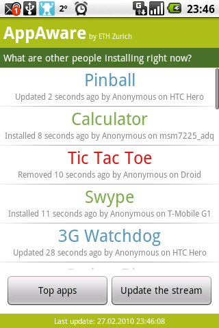 AppAware macht ansonsten nicht viel. Es hockt im Hintergrund und meldet installationen usw. an einen Server der es dann zusammen mit allen anderen meldet. Standardmässig anonym, optional auch mit Usernamen und via Twitter, wie ich es ein paar Tage aktiviert hatte. AppAware ersetzt keinen Test oder Vorstellung einer App aber es gibt Anregungen und eine Art von Überblick was die Leute in der Masse so auf ihrem Androiden haben. |