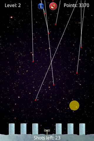 | Missile shield ist ein Klassiker. Das Prinzip ist simpel: Raketen fliegen auf eine Stadt zu, man steuert ein Abwehrgeschütz und muss die Raketen aufhalten. Dazu schiesst man eine Sprengladung in die Flugbahn der Raketen, die entstehende Explostion zerstört auch die Rakete. Praktisch tippt man mit dem Finger in der Flugbahn vor die Rakete und der entstehende Explostionskreis zerstört die Rakete. Absolut simpel, aber die Menge macht’s. Gerade durch das einfache Prinzip und der idealen Steuerung mit dem Touchscreen ist es ein herrliches Spiel für Zwischendurch. |