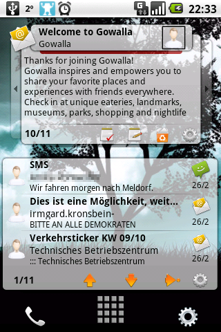 | Etwas wie das Pure messenger widget habe ich lange vermisst. Es kann praktisch jede Art von Nachricht auf dem Standyschirm anzeigen. Zur Wahl stehen Gmail, E-Mail (POP3/IMAP), SMS, Facebook und Twitter. Bei E-Mail, SMS, Facebook und Twitter kann das Programm das für Details aufgerufen werden ausgesucht werden. Damit E-Mail funktioniert muss man noch die App E-Mail for Pure Widget verwenden. Das ist im Prinzip die Standardapp für E-Mail die Android mitbringt die so modifiziert wurde dass auch andere Anwendungen wie das Pure messenger widget auf die Datenbank zugreifen können, was irgendwie Vorraussetzung für die Funktion des Widgets ist Das Widget gibt es in den Größen 4×2, 4×3 und 4×4 und in der Variante als Listendarstellung oder in Karteikartenoptik bei der man bei der vorderen Karteikarte schon den Anfang der Nachricht sieht. Auf dem Screenshot habe ich beide Varianten in der 4×2 Größe auf einem Bildschirm.Verschiedene Designs mit einstellabrer Transparenz stehen zur Verfügung. Der Autor empfiehlt ein Android Gerät der “2. Generation”, was vermutlich bedeutet ‘mit viel RAM’. Mir passiert es regelmässig dass mich beim Aufruf der Einstellungen ein Dialog begrüßt der davor warnt dass in den letzten 5 Minuten der Speicher mal knapp war und dadurch die Funktion beeinträchtigt sein könnte. Wirklich was bemerkt habe ich auf meinem Galaxy aber nicht. |