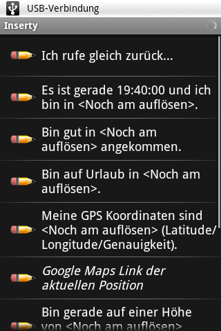 | Inserty hilft dabei Standardtexte für Kurznachrichten, Tweets oder sonstige Anwendungsfälle zu verwalten. Dabei lassen sich nicht nur statische Texte vorgeben sondern auch noch allerlei dynamisch ermittelte Felder einfügen. So kann man z.B. Datum und Uhrzeit verwenden oder auch jeder erdenkliche Ortsbezug vom Land über den Ort bis zur konkreten Adresse oder die Geokoordinaten. Textbausteine 2.0 sozusagen |