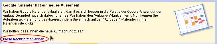 Um die Meldung zu schliessen muss man sie ablehnen. Ablehnen? Was passiert dann? Lehne ich dann auch den Inhalt der Nachricht ab und habe wieder das alte Design?