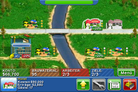 | Hotel Mogul (im Spiel teils auch “Hotel Imperium” genannt) ist ein Aufbaustrategiespiel das mich sofort begeistert hat. Eingebettet in eine kleine Rahmengeschichte ist die Aufgabe ein möglichst großes Hotelimperium aufzubauen. Organisiert in verschiedenen Levels in denen es bestimmte Ziele zu erreichen gilt. Dazu kauft man Grundstücke, baut darauf ein Hotel vom Campingplatz bis Hotelhochhaus oder Unterstützungsgebäude wie ein Café oder Restaurant. Die Hotels kann man aufrüsten was natürlich mehr mehr Gäste bringt. Es gibt gute und schlechte Lagen, zum (Auf)Bau muss man genug Baustoffe kaufen und allgemein seine Finanzen im Blick behalten. Mit den Punkten die man im Spiel erreicht kann man im Menü weitere Gebäudetypen erkaufen, das ‘Grand Palace’ muss man sich erst erspielen. Das Ganze ist an jeder Stelle liebevoll animiert. Selbst im Hauptmenü fahren kleine Autos durch das Hintergrundbild. Spielerisch und optisch sehr gut gemacht, nur stellenweise holprig übersetzt oder nicht ans Layout angepasst, denn einige Elemente sind in der HD (PC?) und Normalversion an verschiedenen Stellen. Das stört aber nicht, es fällt nur auf. Der Spielstand wird gespeichert, man kann verschiedene Spieler anlegen die jeweils ihren eigenen Fortschritt haben. Die kostenlose Lite Version sollte man vorher ausprobieren, ich würde aber dazu raten bei gefallen die 2,99$ zu investieren bevor man alle Lite-Level durchgespielt hat, denn die Vollversion übernimmt nicht den Spielstand so dass man von vorn anfangen muss. ![]() Das Spiel fesselt mich so sehr dass ich für diesen Screenshot fast ‘ne Stunde gebraucht habe weil ich nicht mehr davon loskam |