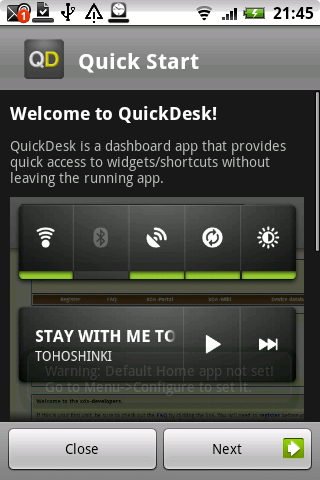 | Quick Desk installiert sich als alternativer Homescreen — ist aber keiner. Aufgerufen wird der Quick Desk durch einen Doppelklick auf den ‘Home’ Knopf. Damit das funktioniert muss sich Quick Desk als aktiver Startbildschirm registrieren. Drückt man ihn nur kurz leitet Quick Desk den Aufruf an die gewohnte bzw. eine einstellbare Startbildschirmanwendung weiter ohne selbst aktiv zu werden. Eine wirklich praktische Erweiterung! |