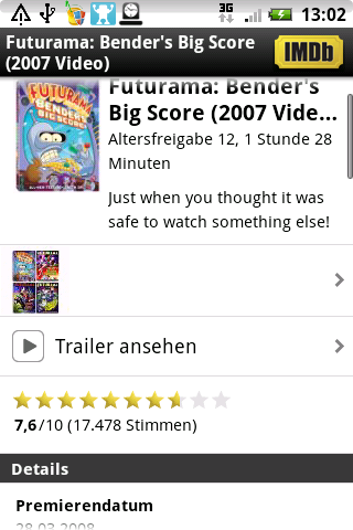 | Die Internet Movie Database ist die wohl größte Filmdatenbank im gesamten Internetz. Angefangen im Usenet als Sammlung von Textdateien dürfte es heute wirklich nichts größeres geben — kommerzielle Verzeichnisse vielleicht ausgenommen. Wobei auch die IMDb längst ein kommerzielles Projekt geowrden ist. Seit ein paar Tagen gibt es nun eine Android App um die IMDb abfragen zu können. Die Einträge sind unterteilt in die Kategorien “Filme”, “TV” und “Leute”, dort werden jeweils prominent die meistgesuchten Einträge der Kategorie mit Bild angezeigt, darunter sind die verschiedenen Direktzugriffe auf Bestenlisten usw.. Für die USA gibt es auch Direktzugriff auf relevatne Links zu Kinofilmen und dem Fernsehprogramm, basierend auf dem aktuellen Standort. Für Deutschland funktioniert das (noch?) nicht, die Standortoption stellt man daher besser in den Einstellungen von GPS auf PLZ um. Zum Film gibt es alle Informationen der Webseite (welche Landesversion verwednet wird ist wählbar) sinnvoll unterteilt so dass man die wichtigsten Informationen sofort sieht und bequem direkt zu der gewünschten Detailinformation springen kann. Zu jedem Film gibt es auch einen Direktlink zu Amazon (auch hier ist die Landesversion wählbar) damit man den gefundenen Film gleich bestellen kann. |