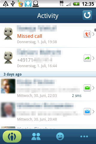 | Phonebook 2.0 ist eine von vielen alternativen Kontaktverwaltungen, besonders an dieser ist aber ihr Allumfassender Ansatz. So zeigt es nicht einfach nur die Kontakte platzsparender, schicker und mit Kategorieunterstützung an sondern bezieht auch die Aktionen mit ihnen mit ein. So zeigt sie in der Kontaktliste direkt mit an wann man das letzt Telefonat mit dieser Person war. Die “Activity” Ansicht ist eine Art nach Tagen sortiert Anruf- und Kurznachrichtenliste. Praktisch ist auch der schnelle Zugriff auf die Mailbox, zu den meistangerufenen Kontakten oder Geburtstage. Ausserdem kann man seinen aktuellen Status bei diversen Social Networks von Twitter über LinkedIn zu YouTube veröffentlichen, das habe ich allerdings nicht ausprobiert. Hab da irgendwie keinen Sinn drin gesehen |