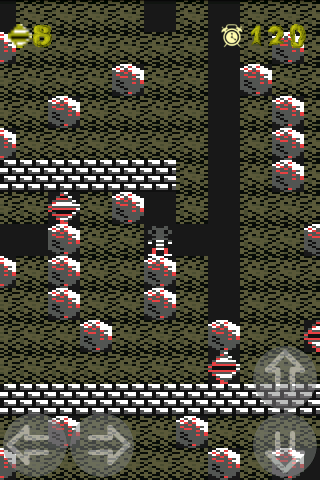 | Boulders and Diemonds ist ein Klon des bekannten Klassikers Boulder Dash. Ein ziemlich genauer Klon, die Grafik könnte direkt übernommen worden sein, ist also eher auf dem Stand von 1984 als 2010. Das mag hässlich aussehen wenn man das Original nicht kennt, wenn man es aber kennt wird das Retro-Feeling nur noch intensiver. Das Spielprinzip für diejenigen die das Original nicht kennen: Gesteuert wird mit dem Steuerkreuz/Trackball oder mit den auf dem Touchscreen eingeblendeten Tasten. 3 verschiedene Layouts stehen dafür zur Auswahl. |
