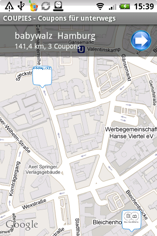 | Coupies ist eine Sammelstelle für lokale Wertcoupons die man über das Handy einlösen kann. Dazu benötigt man die entsprechende App auf seinem Telefon, die bestimmt die aktuelle Position und blendet die in der Umgebung verfügbaren Coupons in der Umgebung ein. Tippt man auf so einen Eintrag werden die Coupons angeeigt, das kann z.B. ein Rabatt von 10% sein oder 10€ oder so. Wie es dann weitergeht kann ich leider nicht testen, hier in Flensburg gibt es keine Coupons und ich will dafür nun keine 100km fahren |