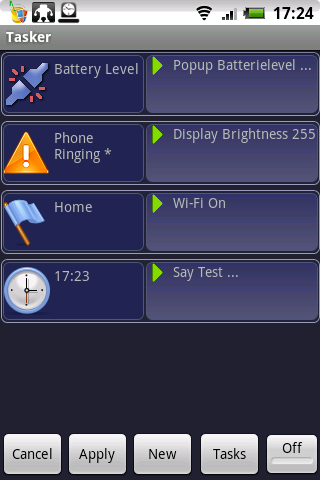 | Tasker ist eine DAS passiert DANN Maschine. Man kann verschiedene Dinge ausführen wenn etwas bestimmtes passiert. Für beide Seiten (Ursache und Wirkung) stehen so ziemlich alle erdenklichen Möglichkeiten zur Verfügung. Das kann etwas ganz simples sein wie eine Warnmeldung oder Ton wenn der Akkustand unter einen bestimmten Level fällt. Auf der Webseite gibt es eine Tour durch das Programm, ausserdem ein Wiki mit einer Sammlung von Profilen die es sich wirklich lohnt durchzusehen um nicht nur zu sehen wie etwas gemacht wird sondern was man überhaupt machen könnte. Tipp: Das Programm gibt es als kostenpflichtige Vollversion im Market oder auch zum auf der Webseite. Die Downloadversion ist zum einen günstiger weil die Provision für den Android Market entfällt, sie läuft auch 14 Tage kostenlos als Testversion. |