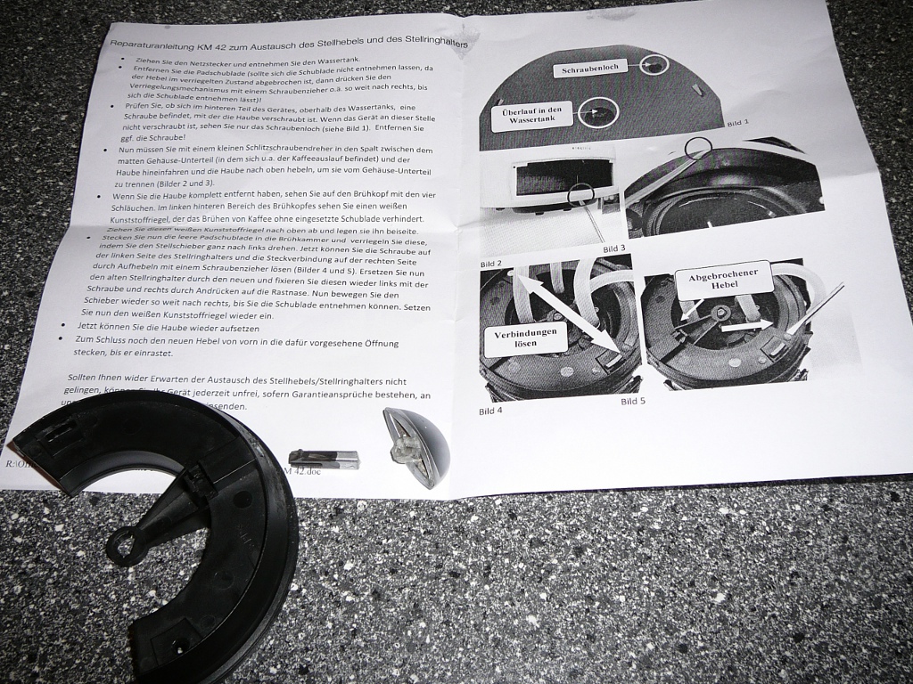 Reparaturmöglichkeit (z.B. KM 42) Hebelabbruch: Das Gehäuse oben entfernen (vorsichtiges Hebeln von unten in den Einrast-schlitzen mit Schraubendreher). Dann abgebrochenes Hebel-Reststück aus Gerät entfernen. Dann mit kleinem Akkuschrauber und kleinstem (ca. 05, mm) Bohrer in den Hebelkopfrest ca. 1 cm tiefes Loch an der Bruchstelle mittig bohren und das Resttück durchbohren in der Mitte. Dann bis auf 2 mm aufbohren. Dann dünne ca. 2 cm lange Kreuzschlitzschraube in den Hebel ca. 1 cm eindrehen, dann Schraubenkopf mit Zange abkneifen und Kneifstelle spitz feilen. Dann durchbohrtes Reststück auf verbliebene Schraubengewinde aufdrehen und fertige Teil wieder einsetzen. Evtl. zuvor noch etwas Leim zusätzlich an Bruchstelle