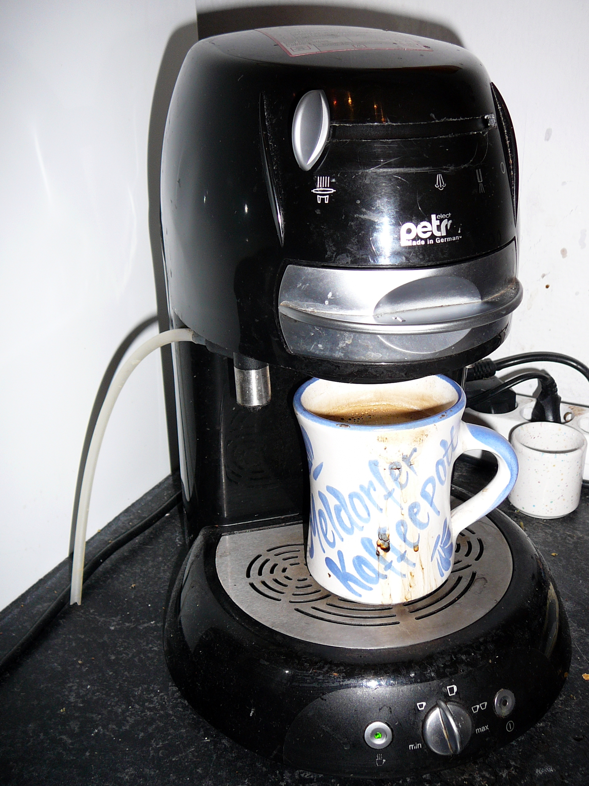 Beim zweiten mal habe ich ausprobiert ob man die Kaffeepads wie Filterkaffee mit etwas Schokopulver verfeinern kann. Das Resultat war ein verklemmtes Pad und bei meinem enthusiastischen Befreiungsversuch habe ich den Stellhebel abgebrochen.