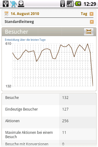 | Um die Auswertungen von Piwik auf dem Android Telefon anzusehen gab es bisher nur den Web Analytic Client (vorgestellt in Folge 13) da Piwik für die Graphen Flash verwendet. Ob es mit den neueren, flashfähigen Androiden funktioniert weiss ich nicht. Aber auch hier dürfte gelten, dass die Graphen für den PC gemacht sind und nicht für Endgeräte mit kleinem Display. Vorbei. Seit ein paar Tagen gibt es Piwik Mobile, eine offizielle App für Android. Und die ist verdammt gut geworden, obwohl noch als Beta deklariert. Praktisch alle Auswertungen die man auch auf dem PC sehen kann hat man so auch mobil im Zugriff, in einem gekonnt für das kleine Telefondisplay angepassten Interface. Das zeigt sich z.B. nicht nur darin, dass man sich die Widgets der Webseite hier aus Platzgründen einzeln ansieht, sondern auch dass die Graphen anders skaliert werden. Der Besuchergraph der auch auf dem Screenshot zu sehen ist wirkt auf den ersten Blick so als wenn es heute noch gar keine Besucher gab. Achtet man aber drauf sieht man dass die Skala erst bei 132 Besuchern beginnt. Min und Max entsprechen also dem realen Minimal- und Maximalwert der Daten. Was mir normalerweise ein Graus ist schafft auf dem kleinen Display aber mehr Platz für die relevanten Daten. Wenn Du die App ohne eigene Piwik Installation ausprobieren willst kannst Du gern die Statistiken meines Blogs eintragen: Einfach http://stats.stdlw.de/piwik/ als URL zur Piwik Installation eintragen und ‘Anonymer Zugriff’ aktivieren. Der Link funktioniert auch für den Zugriff vom PC aus. |