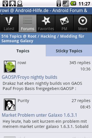 | Wer viel in Webforen unterwegs ist möchte vielleicht ab und zu mal auch von unterwegs darauf zugreifen. Sei es um etwas nachzulesen das man dort schon gelesen hatte oder um zu gucken ob es eine neue Antwort gibt oder vielleicht auch um schnell etwas zu schreiben. Die meisten Foren sind aber nicht für das kleine Display optimiert bzw. bieten eine angepasste Ansicht. In solchen Momenten treten wieder die Vorteile des alten USENET hervor: dort gab und gibt es nur den eigentlichen Nachrichtentext. Besser, weil für kleine Displays ausgelegt ist der Zugriff auf Webforen mit Tapatalk. Tapatalk zeigt eine optimierte Version des Forums an. Der Zugriff erfolgt mit dem eigenen Benutzeraccount des Forums, Informationen über schon gelesene Threads, letzter Zugriff usw. bleiben also Konsistent. Die kostenlose Demo Version erlaubt das Lesen, wer auch schreiben will muss sich die Pro Version kaufen. 5136 Foren (Stand: heute Morgen) haben das dazu nötige kostenlose Plugin bei sich integriert, darunter auch das android-hilfe.de Forum in dem ich meist aktiv bin. Das Plugin gibt es für die wichtigsten Forensoftwaren. Installieren muss es der Forenbetreiber, das kannst Du nicht selbst, man kann es aber anregen. Was ich durchaus machen würde, das Plugin kostet nichts, bringt aber evtl. mehr Leben auf die Seite. Dass Design und auch die Werbung dabei unter den Tisch fallen ist notwendig für die Darstellung auf dem Handydisplay und normalerweise auch die Hauptgründe die einen mobilen Zugriff verhindern. Man verliert also keine Views auf die Werbung. |