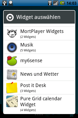 | Zum Abschluss ein kleines Tool für Leute die auf ihrem Telefon root sind. Das kleine Programm AppWidgetPicker von boombuler bringt Ordnung in die Widgetliste. Widgets sind unheimlich praktisch, leider listet Android sie einfach nur auf wenn man eines hinzufügen möchte. Mehr muss es ja auch nicht sollte man meinen, aber viele Programme haben nicht nur ein Widget sondern verschiedene und die auch noch in verschiedenen Größen. Sinnvoller geht es mit dem AppWidgetPicker: Da man das Programm nicht einfach so installieren kann (kann man schon, dann funktioniert es aber nicht) können es nur Leute einsetzen die root Zugang auf ihrem Gerät haben. Die kopieren die .apk einfach in den Ordner /system/app/ — des Systems, nicht der Speicherkarte! AppWidgetPicker ist nicht im Market zu bekommen sondern in diesem Thread bei xda-developers. |
