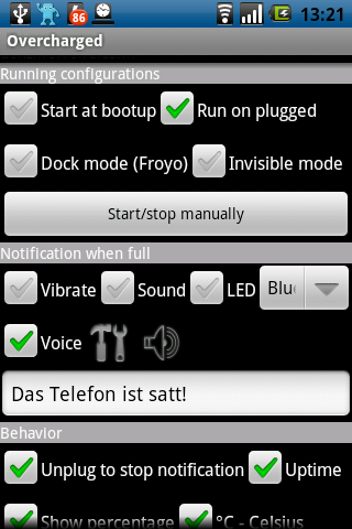 - Overcharged — gibt Meldung wenn das Telefon voll geladen ist