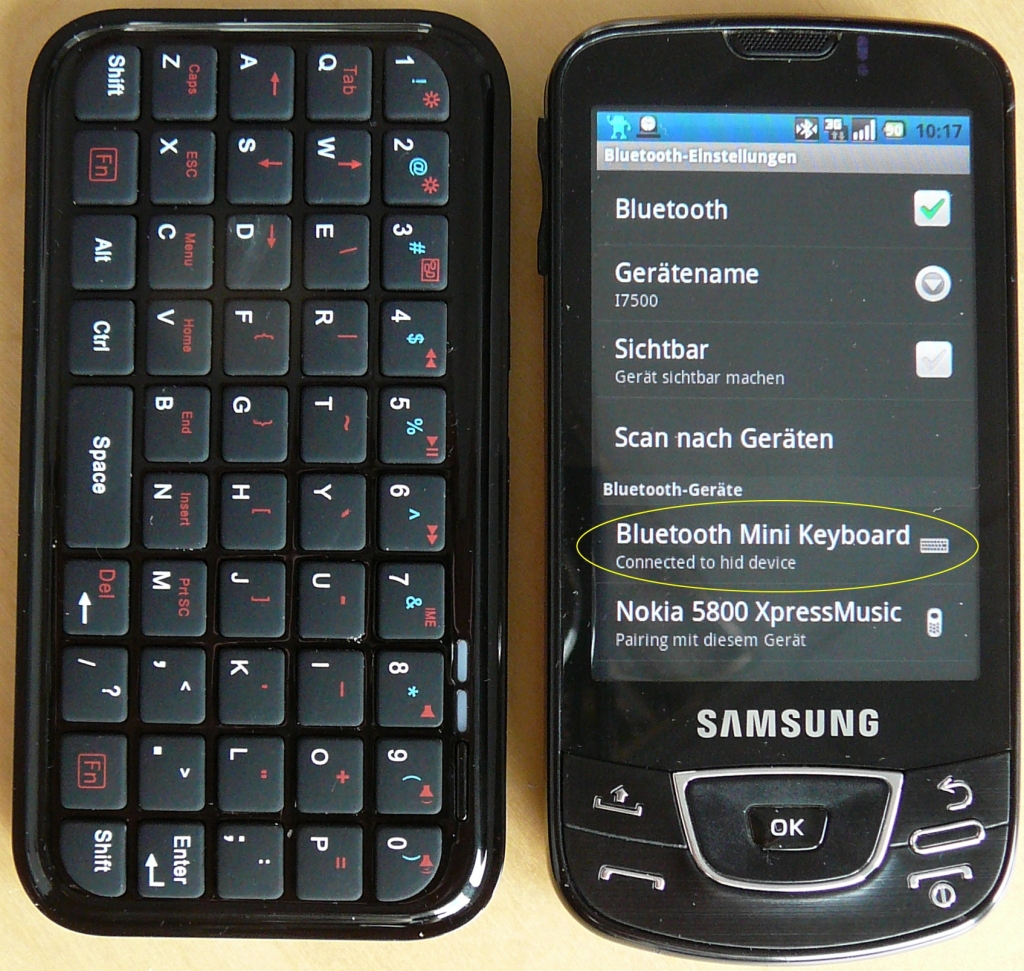 1 Das Pairen scheiterte bei mir anfangs weil ich die nötige PIN nicht kannte. Der entscheidende Hinweis steckt in der Anleitung von BlueKeyboard: man initiiert das Pairing auf dem Telefon und gibt dort eine beliebige PIN ein. Diese PIN tippt man auf der Bluetooth Tastatur blind ein und drückt Enter (Die Tastatur muss dazu im Verbindungsmodus sein).