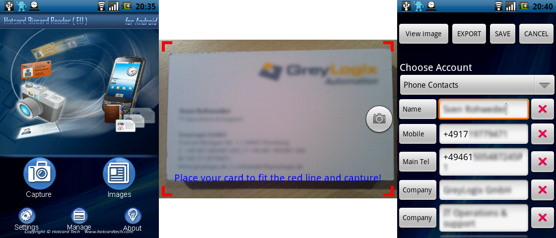 | Der BusinessCard Reader rüstet eine Funktion nach die in der Geschäftswelt oft praktisch ist: Die App kann Visitenkarten auf totem Holz einscannen und als Kontakt hinzufügen (Mein voriges Smartphone, das Sony Ericsson P1i brachte das übrigens serienmässig mit). Die Vorgehensweise ist simpel: man fotografiert mit der App die Visitenkarte — oder wählt das Bild einer gespeicherten Karte aus — und das Programm jagt seine Texterkennung darüber und versucht die erkannten Zeichenfolgen den Feldern der Kontaktverwaltung zuzuordnen. Das Ergebnis erscheint in einem Editor in dem ma die fast unvermeidlichen Fehler korrigieren kann. ![]() Probiert habe ich es mit meiner privaten und beruflichen Karte und bei Beiden war die Erkennung nicht fehlerfrei, aber jeweils zu etwa 90% korrekt. Die nötigen Korrekturen sind minimal, mal eine Zahl oder es wurde das falsche Feld (Fax, Mobiltelefon usw.) ausgewählt. Wer regelmässig Kontaktdaten auf Papier bekommt sollte sich das Programm ansehen, es erleichtert die Erfassung ungemein. Das Programm ist im Market in allen Regionalvarianten kostenlos, bietet aber nur 10 Scans. die Vollversion der Europaversion kostet 5,99$ (~4,28€). Das finde ich für die geschäftliche Nutzung OK. Achte aber auf die Sprachversion, die Version mit alle Regionen ist günstiger (8,99$) als zwei Regionalversionen. |