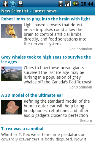 | New Scientist ist eine Nachrichten App des gleichnamigen Wissenschaftmagazins. Es handelt sich also um wissenschaftliche Artikel (auf englisch). Sie sind unterteilt ‘Latest Articles’, ‘Categories’ und ‘Galleries’; also neueste Nachrichten, Kategorien sowie Bildgalerien. Die Artikel und Meldungen sind von gewohnter Qualität, eher selten für die Wartezeit an der Bushaltestelle geeignet. Das sind die Galerien naturgemäss eher, allerdings sollte man auch bei ihnen die Uhr im Auge behalten, sie sind in der Regel auch fesselnd-faszinierend. |