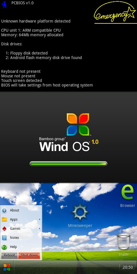 | Wind OS ist ein reines Spaßprogramm ohne tieferen Sinn. Es emuliert den kompletten Startvorgang einen Windowsartigen Betriebssystems auf dem Telefon. Vom BIOS über den Boot des Systems bis zur Oberfläche. Im System selbst kann man nicht fürchterlich viel tun. Es gibt einen Browser und Minesweeper, mehr nicht. Völlig sinnfrei, aber das erste Mal doch spassig, auch beim rumzeigen. |