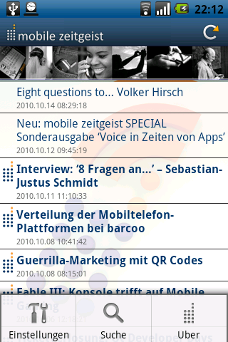 | mobile zeitgeist Es zeigt den RSS-Nachrichtenfeed des Blogs im Volltext, inklusive Volltextsuche. Die Artikel werden zwischengespeichert so dass man sie auch offline lesen kann. |