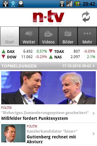 | Auch n-tv Nachrichten ist eine allgemeine Nachrichten App, aber wie der Name sagt direkt vom Fernsehsender n-tv. Wie im Fernsehprogramm hat man auch hier einen (allgemeinen) Börsenticker immer im Blick, man hat Zugriff auf alle Nachrichten, Bilder und Videos die man auch auf der Webseite im Zugriff hat. Das Interface ist zweckmässig, die Artikel werden lokal zwischengespeichert so dass man auch ohne Internetverbindung lesen kann. |
