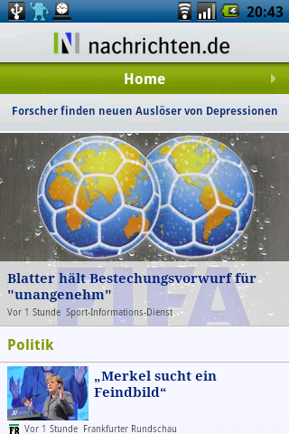 | Mit nachrichten.de komme ich zu einer “allgemeinen” Nachrichten App. Das Programm aggregiert diverse Nachrichtenquellen (Nachrichtendienste, Zeitungen, Magazine) in diversen Themenbereichen. Den Themenbereich wie in der grünen Zeile oben angezeigt, dort wechselt man auch zwischen ihnen. Woher die jeweilige Meldung kommt steht jeweils direkt dabei. Unter der Bereichsüberschrift ist eine Zeile für einen Meldungsticker aus allen Bereichen. Ich würde es grob mit google news vergleichen, man bekommt Meldungen aus allen Bereichen und auch aus diversen Quellen automatisch zusammengestellt. Wer mag kann sich auch auf der Webseite ansehen was einen erwartet. |