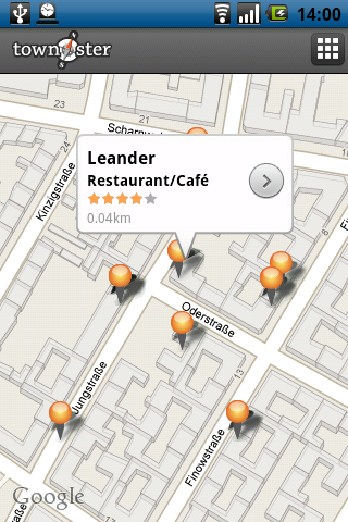 | Den Anfang macht eine Anwendung die ich gar nicht wirklich testen konnte. Ich kann sie starten und mich umsehen, aber praktisch ausprobieren geht nicht. Townster ist eine Location-based “Hier bin ich”-Bewertungs-Coupon App für Berlin. Eine iphone Version gibt es schon länger und neuerdings auch eine Android Version und die Jungs hatten gefragt ob ich sie nicht vorstellen würde. Praktisch ausprobieren kann ich sie ob der Entfernung nicht, aber damit rumspielen. Sie sieht sehr interessant aus und der ein oder andere liest mich ja aus Berlin oder der Nähe. Eine Ausweitung über Berlin hinaus ist geplant, aber ob gleich bis an die dänische Grenze wollten sie mir nicht versprochen Aber vorstellen kann ich sie ja schon mal: Townster ist ein Komplettpaket was man so unterwegs machen oder gebrauchen kann: man kann sich wie bei Diensten wie foursquare oder gowalla an bestimmten Orten einchecken (“Ich bin jetzt hier”), das kann man auch in einem Ticker verfolgen, die Orten kann man bewerten wie bei qype und es gibt Gutscheine und virtuelle Stempelkarten die Vergünstigungen bringen. Ich hoffe ich habe kein Feature übersehen So gesehen gibt es für jedes einzelne Feature auch schon spezialisierte Dienste, mit Townster hat man aber alles auf einmal in der Hand und muss nicht wechseln. Vom Funktionsumfang ist es für Unterwegs ziemlich komplett und es sieht zumindest sehr praktisch aus, vielleicht kann ja ein Leser aus Berlin etwas dazu sagen wie es in der Praxis ist. |