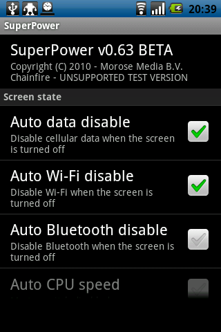 | Super Power ist ein Stromsparhelfer ähnlich wie Juice Defender. Es steuert die Energieverbraucher abhängig von der Benutzung des Telefons. Ist das Display aus wird die Datenverbindung unterbrochen und zyklisch kurz reaktiviert damit Programme im Hintergrund ihre Daten aktualisieren können. WLAN wird so gesteuert, genauso wie Bluetooth, GPS und sogar die Geschwindigkeit der CPU. Die Features sind also wie bei Juice Defender, es ist allerdings unübersichlicher, was aufgrund der Fülle der Optionen durchaus nicht nur ein Optischer Nachteil ist. Es arbeitet aber im Gegensatz zu Juice Defender rein Eventbasiert, d.h. es überwacht nicht im Hintergrund was passiert sondern lässt sich bei den relevanten Ereignissen (Display aus oder an, Batterielevel usw.) vom System starten und geht anschliessend wieder schlafen. Das spart Ressourcen, was gerade auf älteren Geräten wichtig ist. |