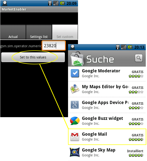 Der Android Market ist auf praktisch jedem Gerät das die Anforderungen an die Hardware (u.a. GPS, Lagesensoren) erfüllt verfügbar. Welche Programme man sieht hängt zum einen vom Gerät (Android Version, Bildschirmauflösung) ab, zum anderen aus welcher Region man stammt. Nicht jedes Programm gibt es überall auf der Welt. das betrifft zum einen kostenpflichtige Anwendungen, das Bezahlversion Google Checkout ist nicht überall verfügbar. Aber Entwickler können generell die Bereiche einschränken. Ist das bei Programmen wie S-Banking sinnvoll da ein Amerikaner kaum ein Konto bei einer deutschen Bank hat, ist es bei Programmen wie Google Mail für mich nicht nachvollziehbar. Die aktuelle Version 2.3 erfordert Android 2.2 ist aber auch dann in Deutschland (noch?) nicht verfügbar — höchstens vorinstalliert. Der Market unterscheidet die Region nicht nach dem Aufenthaltsort, auch wenn ich mich am Schreibtisch in ein dänsiches Netz einwähle sehe ich Google Mail nicht, sondern nach der eingelegten SIM. Mit einer dänsichen SIM sehe ich Google Mail im Market.Nun hat nicht jeder eine passende ausländische SIM zur Hand, für Leute mit root Zugang schafft der MarketEnabler aber Abhilfe: Er gaukelt dem Market eine andere MCC+MNC (Länderkennung und Betreiberkennung) vor und schaltet so die Anwendungen frei die es nur in dem entsprechenden Land gibt. Die Änderung ist nicht Dauerhaft und wird beim Neustart oder Wechsel in den Flugzeugmodus zurückgesetzt. Man kann den alten Wert auch speichern und manuell wiederherstellen bzw. ihn beim Start des Telefon automatisch setzen lassen. |