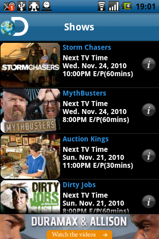 | Vom amerikansichen Discovery Channel stammen Wissenschafts-Unterhaltungssendungen wie Myth Busters und Storm Chasers. Pseudowissenschaftliche leichte Kost mit unbestreitbarem Unterhaltungswert. Die Eigenproduktionen des Senders kann man sich auch nach Wunsch mit der App des Senders auf dem Android Telefon ansehen. Sie ist allerdings nicht im europäischen Market, daher muss man sich mit dem MarketEnabler oder dem Fast Web Installer behelfen. Ersterer gaukelt eine fremde SIM vor, letzterer kümmert sich nicht um die Einschränkung.Anschliessend kann man sich die 1-2 Minütigen Clips gezielt nach Sendung oder Kategorien wie Meistgesehen ansehen. Keine hochwissenschaftlichen Sendungen, aber die kurzen Clips sind eine gute Unterhaltung für Zwischendurch. |