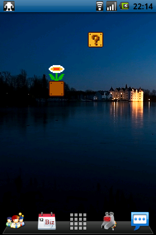 | Dieses Widget ist absolut unnütz. Es stellt keine Informationen dar, ist keine Abkürzung irgendwo hin oder macht sonstwas nützliches. Das heisst, fast. Denn es macht Spaß. Du kenst sicher die Klötze in Super Mario, Giana Sisters und Co. Man springt drauf oder von unten gegen. Von unten entlockt man dem Klotz irgendwassinnvolles, Gold, ein Bonuselement o.ä.. Und genau das ist das Mario Item Block Widget. Man tippt drauf und etwas kommt raus. Ein Goldsück, ein Pilz, eine Sonne und so. Mehr nicht. Man bekommt auch kein Extraleben. Es ist einfach nur ein sinnloser Spaß |