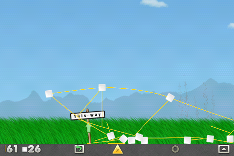 | Das Independent Spiel “World of Goo“ liebe ich und hatte mir auch schnell eine Version für Touchscreen Geräte wie Android Telefone gewünscht. Das Original gibt es zwar noch nicht für Android aber mit Spaghetti Marshmallows eine würdige Ersatzdroge. Hier baut man nicht mit Goo-Bällen Konstruktionen zum Ziel sondern mit Marshmallows und Spaghettis. Ziel ist es, einen Marshmallow in jeden Zielring zu platzieren. Dazu baut man Konstruktionen aus Marshmallows und Spghettis auf. Man legt einen Marshmallow auf den Boden und steckt da einen Spaghetti rein. Auf diesen kann man wiederum einen Marshmallow stecken und darein dann wieder einen Spaghetti. Und so weiter bis man beim Zielring ist. Das Ganze mit Schwerkraft und Bewegungsdynamik und so, wie man es von Goo gewohnt ist. Ein herrliches Spiel, aber spielt das lieber auf dem Telefon, nicht in der Küche nachmachen |