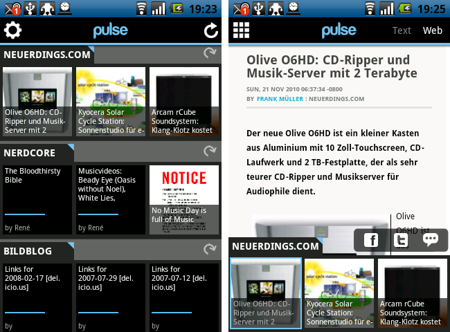 | Der Pulse News Reader ist kein Usenet-News Reader wie ich erst dachte sondern einer für RSS-Feeds. Nachdem er letzte Woche kostenlos geworden ist hab ich ihn mir mal angesehen. Und er ist wirklich einen Blick Wert! Diese Darstellungsweise kostet Platz, ist also für wirkliche viele Feeds eher nicht geeignet. Aber für die wichtigsten Feeds die man schnell im Blick haben will ist das wirklich genial. |