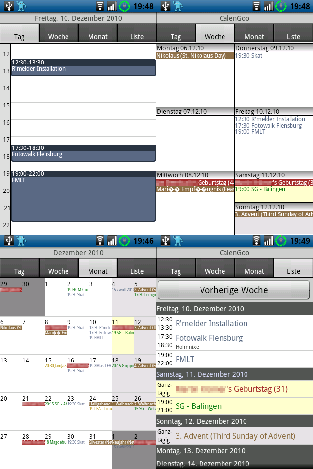 | CalenGoo ist eine weitere sehr vielversprechende Kalenderanwendung. Im Gegensatz zu den Beiden eben vorgestellten Widgets handelt es sich hier um eine vollständige Kalenderanwendung. Sie hat Ansichten für Tag, Woche und Monat sowie eine Terminliste. Dazu noch 4 Widgets: 2 Terminlisten, eine Tagesansicht und eine Monatsansicht. Die Tagesansicht ist dabei eine Terminliste des nächsten Tages mit Terminen, die Monatsansicht entspricht der Kalenderansicht in der Größe 4×3. Im Großen und Ganzen war es das auch schon, aber das ist schon sehr ordentlich gemacht. Durch die Reiter oben wechselt man direkt zur gewünschten Ansicht, das Programm ist dabei auch sehr schnell und praktisch. Daher ist es momentan meine Standardkalenderanwendung, derzeit kann ich mich nur schwer zwischen CalenGoo und Business Calendar (vorgestellt in Folge 52) entscheiden. Hilft nichts: da muss noch eine weitere Alternativ her CalenGoo ist noch Beta und in der aktuellen Version immer nur gut 1-2 Wochen benutzbar. Es kommt aber alle paar Tage ein Update, man hat also immer eine lauffähige Version. |