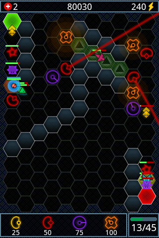 | “Tower Defense” Spiele hatte ich schon ein paar Mal hier im Blog, sie sind auch sehr gut umsetzbar auf/für Touchscreen-Geräte. Eine sehr schöne Variante habe ich diese Woche getroffen, nämlich Defensoid. Das Grundkonzept it wie immer: die gegnerischen Einheiten (“Oids”) bewegen sich vom Start zum Ziel und man baut Verteidungungstürme die sie aufhalten sollen. Defensoid ist dabei auf einem Hexagonalem Grundfeld angesiedelt und hat eine herrliche Retro-Optik. Sowohl die Türme als auch die gegenerischen Einheiten könnten auf dem ersten Blick einem 20 Jahre alten Spiel entsprungen sein, auf dem zweiten sieht man aber an der flüssigen Bewegung und dem sanften glühen der Strahlungstürme deutlich dass das Spiel technisch auf Höhe der Zeit ist.Als Verteidiger gegen die Oids hat man nur 4 Türme zur Auswahl: einfache Kanonen, Strahlentürme die eine gerade Linie aussenden und alle Oids treffen die in der Reihe sind, Raketentürme mit zielsuchenden Raketen kurzer Reichweite sowie die erwähnten Strahlungstürme die an ihnen vorbeilaufende Oids verlangsamen. Auch bei diesem Tower Defense Spiel sollte man die Türme in den Weg der Oids stellen damit diese einen Umweg laufen müssen. Doch Vorsicht: es gibt Spezialbodenfelder die die Oids negativ oder positiv beeinflussen. Sie können sie verlangsamen oder Beschelunigen, verletzen oder heilen. Also aufgepasst, sonst lenkt man die Oids direkt über Heilfelder und macht sich selbst die Verteidigung schwer. |