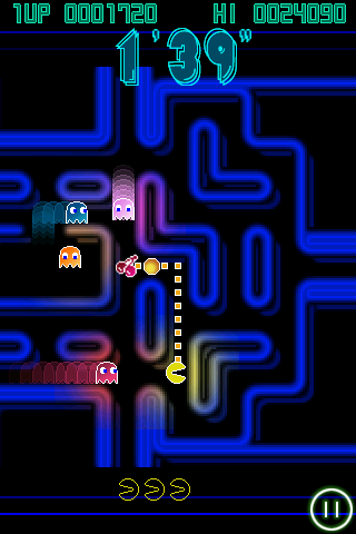 PAC-MAN ist legendär und es gibt unzählige Kopien des mittlerweile 30 Jahre alten Klassikers. PAC-MAN Championship Edition ist aber soetwas wie das Original. Nicht ganz das Original, das gibt es auch, sondern eine modernisierte Variante direkt vom Originalhersteller Namco. Das Spielkonzept und vor allem die Töne sind dabei im Grund gleich geblieben und es fühlt und hört sich herrlich nach alter Spielautomatenhölle an. Ein paar wenige modernisierte Töne sind dabei, die passen sich aber herrlich in die klassische Soundkulisse ein. Auch die Wände im 3D-Look die anfangen zu verschwimmenden wenn man eine der Energizer gefressen hat und die Geister jagen kann passen einwandfrei in die klassische Kulisse.Die Championship Edition hat ein etwas anderes Spielkonzept als das Original: musst eman ursprünglich “nur” das Labyrinth leerfressen so spielt man hier eine bestimmte Zeit und muss darin so viele Punkte wie möglich erreichen. Das Labyrinth ist auch nicht randvoll gefüllt mit Punkten sondern immer nur an bestimmten Stellen. So jagt man unter Zeitdruck die Punkte, erscheinende Bonuselemente wie Krischen und immer wieder auch die Geister. Und man jagt sie wirklich, schliesslich läuft die Zeit und es geht um Punkte. Ein sehr schön adaptierter Klassiker. Ich bin mir nur nicht sicher wie man ihn auf Geräten ohen Trackball/D-Pad steuert. |