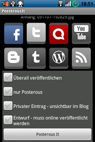 | So ziemlich jedes Programm unter Android hat eine Möglichkeit etwas an ein anderes Programm oder Onlinedienst weiterzugeben (“share”). Nutzer des Blogdienstes Posterous hatten bisher aber keine derart einfache Möglichkeit. Sein Posterous Blog füllt man relativ einfach per E-Mail, anhand des Empfängers kann man dabei sehr einfach bestimmen was mit dem Eintrag (Text, Bild, Video) geschieht: schickt man die Mail an post@posterous.com wird der Eintrag normal veröffentlicht, schickt man es <dienst>@posterous.com, z.B. twitter@posterous.com wird es im Blog veröffentlicht und nur an Twitter weitergemeldet, auf diese Art kann man auch mehrere Dienste kombinieren. Das geht vom Schlaufon aus ganz gut, aber die Empfänger von Hand zusammenzustellen ist fehleranfällig. Das hat Grischa zum Anlass genommen mit PosterousIt seine erste Android Anwendung zu erstellen. Die App bietet sich als Ziel für die Medienweitergabe an und man kann anschliessend bequem einstellen was mit dem Inhalt geschehen soll. Anhand dem was man hier auswählt wird eine E-Mail vorbereitet die dann wiederum an das E-Mail Programm seiner Wahl weitergegeben wird. Hier braucht man (wenn man will) nur noch Betreff und Text eingeben und die Mail abschicken um den Eintrag zu veröffentlichen. Einfach und gut, ein must-have für jeden Posterous-Nutzer. |