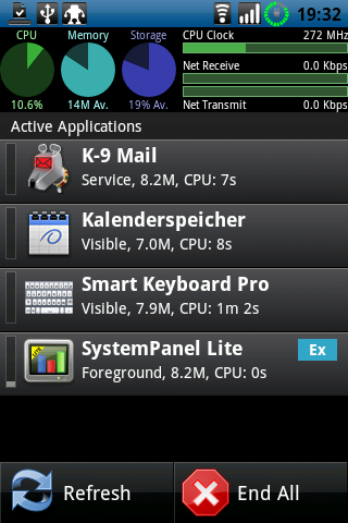| Der SystemPanel Task Manager ist ein Systemmonitor und Taskmanager der sehr schön auf die Fingerbedienung angepasst ist. Statt einer relativ kleinen Taskliste sieht man die Programme recht groß, dazu noch weiter Informationen wie die CPU-Last und den freien Speicher als anschauliche Kuchendiagramme. Details erscheinen wie gewohnt auf Fingertipp inklusive Verlaufsgraphen. Die kostenpflichtige Version ist darüber hinaus auch in der Lage den Ressourcenverbrauch im Hintergrund zu protokollieren. In der Lite Version bekommt man zwar auch einen Verlauf, aber nur während das Programm im Vordergrund aktiv ist. Im Hintergrund geht das Programm dabei schonend vor, nur alle 15 Minuten wird eine Momentaufnahme der Ressourcen und aktiven Programme gemacht. Es ist somit nicht für kurzfristige Analysen gedacht sondern eher um zu sehen was im Laufe eines Tages und wie viel aktiv ist und Ressourcen verbraucht. Das Programm hat darüber hinaus auch einen Taskkiller dabei, der allerdings mit Android 2.2 wie alle derartigen Tools deutlich beschränkt wurde und als “normales” Programm nur noch die Programme beenden kann/darf die sich nicht dagegen wehren. Da das manuelle abschiessen eines Programms bei Android nur selten sinnvoll ist ist das aber keine entscheidende Einschränkung. |
