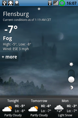 | GO Weather ist eine Wetter-Anwendung aus China. Und wie es sich für asiatische Software gehört hat sie eine tolle Optik. Aber auch Abseits des Klischees ist sie durchaus praktisch. Wie man sieht sieht man das aktuelle Wetter, den nächsten Tagesabschnitt, den nächsten und übernächsten Tag direkt auf dem Hauptschirm. Warum es für Morgen und Montag unterschiedliche Werte anzeigt weiss ich aber nicht, nach meinem Kalender ist das der gleiche Tag Der Ort wird nicht selbst bestimmt sondern man kann häufig genutzte Orte hinterlegen und daraus auch seinen Favoriten auswählen. Haupteigenschaft ist aber die wunderbare Animation. So wabert der Nebel auf dem Screenshot herrlich düster durch’s Bild und wenn ich mir das ‘Partly Cloudy’ von Morgen ansehe fliege ich durch eine schön animierte Wolkenschicht. Wirklich schick gemacht. |